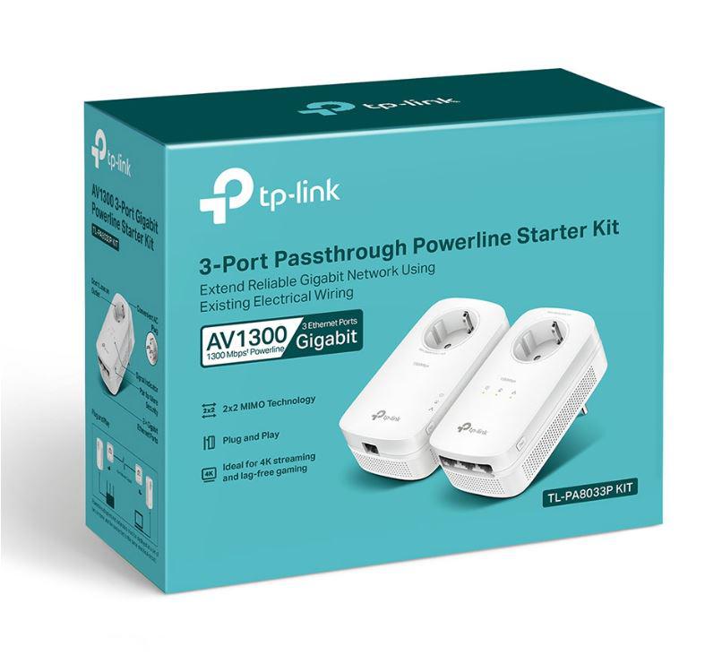 TP-Link Kit Gigabit Powerline Passthrough cu 3 Porturi AV1300, TL- PA8033P KIT, Standarde si Protocoale: HomePlug AV1.1, HomePlug AV2.0,IEEE 1901,IEEE 802.3,IEEE 802.3x, IEEE 802.3u, IEEE 802.3ab, Interfata: 3 x 10/100/1000 RJ45, 1 x priza alimentare, Consum: Max 5.5W, Dimensiuni: 131 x 71x 42 mm, Acoperire: 300m prin reteaua de current electric, Kit-ul contine: 1 x TL-PA8010P, 1 x TL-PA8030P, 2 × Cablu Ethernet.