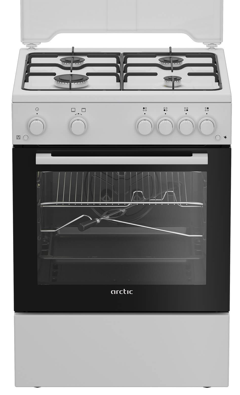 Aragaz Arctic ABGM6611DTTL, Gaz 4 arzatoare, Aprindere electrica plita/cuptor, Safety Plus, Grill gaz, Timer, Arzatoare cu eficienta ridicata, 60 cm, Alb