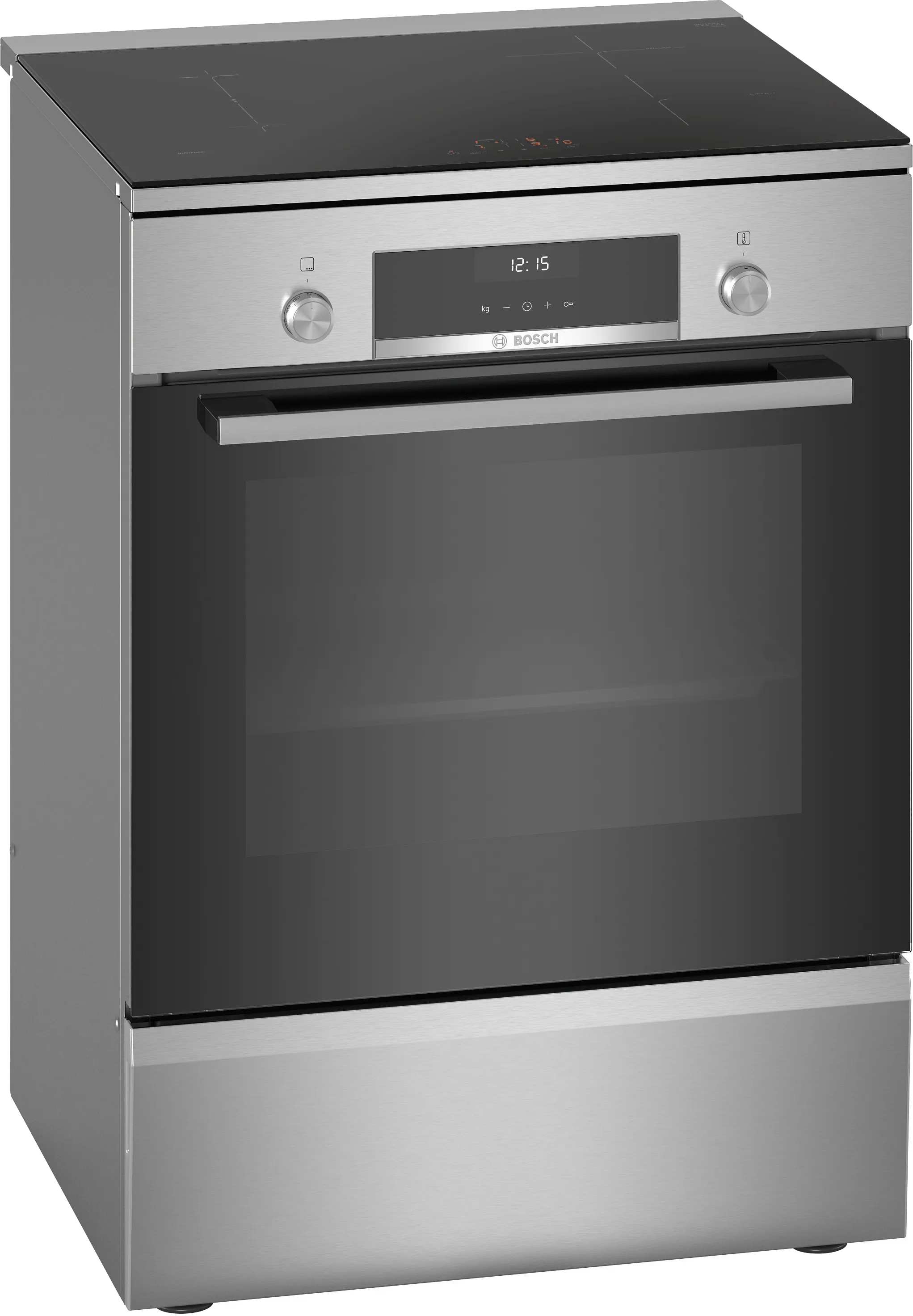 Aragaz Bosch HLS59D351, Electric, Plita inductie, 4 zone gatit , Control electronic, Cuptor electric, 66 L, Grill, Autocuratare EcolClean + hidrolitica, 3D Hotair, 2 suporti telescopici, sertar depozitare, Timer, 60 cm, Inox