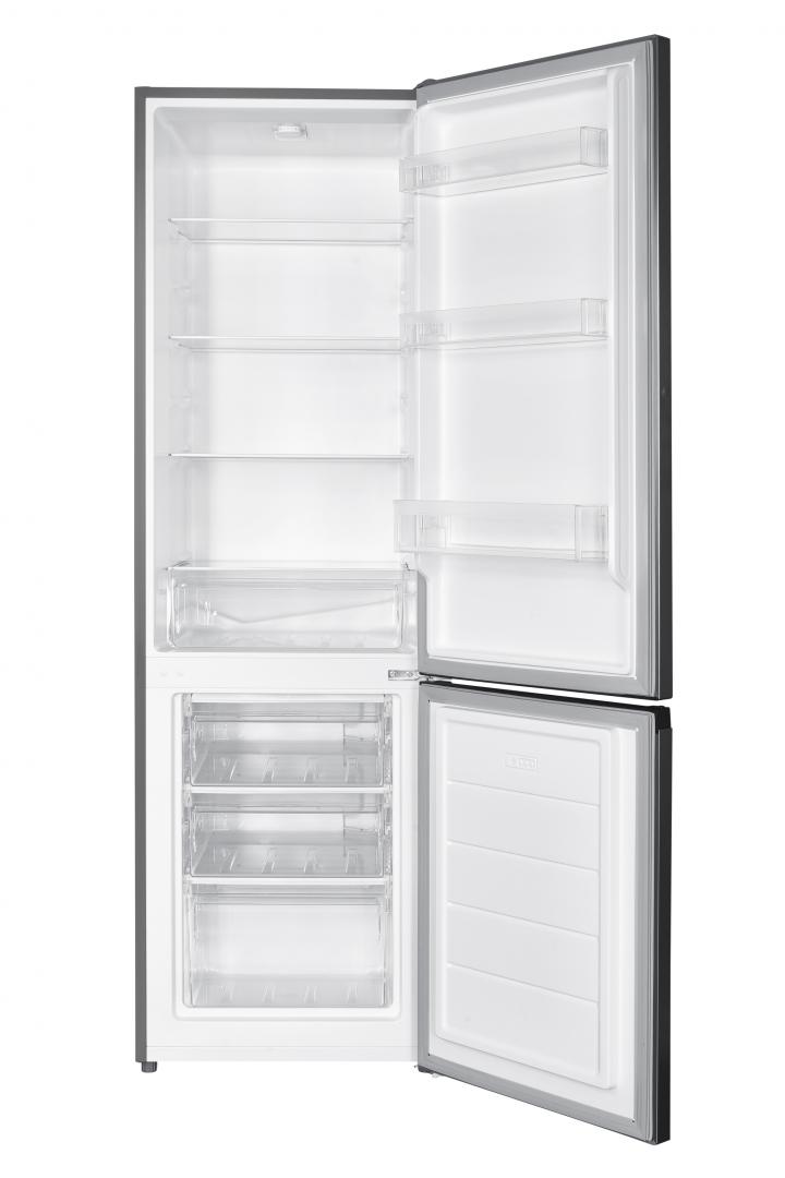 Combina frigorifica Heinner HC-HM262XE++, clasa energetica: E, capacitate totala: 262L, capacitate frigider: 191L, capacitate congelator: 71L, control electronic cu termostat ajustabil, lumina LED, 3 rafturi sticla frigider, compartiment pentru fructe si legume, 3 sertare congelator, usi reversibile, suport oua, tavita cuburi de gheata, capacitate congelare: 3.2kg/24h, dimensiuni (WxDxH): 55 x 56 x 180 cm, culoare: Aspect inox