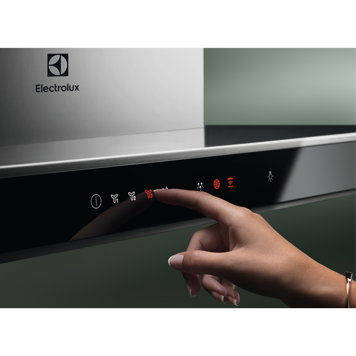 Hota semineu dreapta Electrolux LFT769X, 700 mc/h (intensiv), Front de sticla, 1 motor, 3 viteze+intensiv, Control electronic, Filtre de aluminiu lavabile, Conectivitate plita, Filtru de carbon inclus, Latime 90 cm, Inox