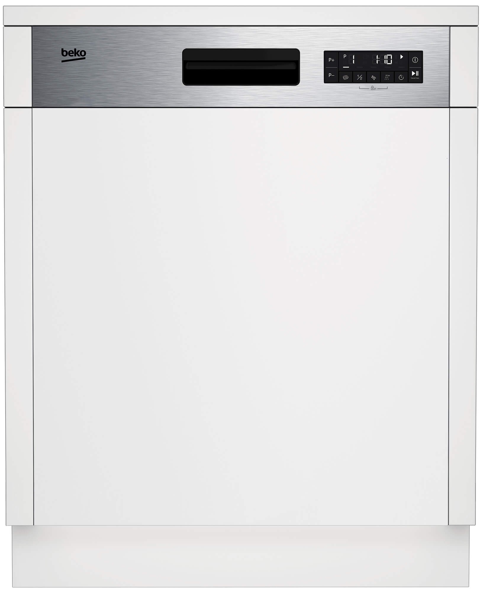 Masina de spalat vase Beko, semi-incorporabila 60cm, capacitate 14 seturi, control electronic, display LCD, clasa energetica D, 6 programe: Eco 50°C, Auto, Intensive 70°C, Quick&Clean, Mini 30', Prespalare, functii speciale: Half Load, Tablet, SelfDry, SteamGloss, nivel de zgomot 45dB, dimensiuni (?xLxA): 81.8x59.8x57 cm, culoare panou: inox