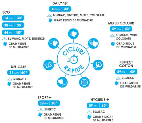 In functie de gradul de murdarire si tipul tesaturii cele 7 programe scurte iti permit sa economisesti energie si timp. Masina de spalat Candy Smart Pro are cele mai multe programe rapide din toata gama de masini de spalat de pe piata.