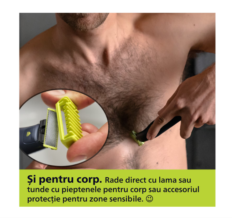 Aparat de ras (0,2mm) si tuns (0,4-10mm) PHILIPS OneBlade Pro QP6542/15, Fata&corp, pieptene cu 14 setari de lungime (0,4-10 mm), 2 accesorii pentru utilizare pe corp, 2 lame 360, 90 min (Li-ion), cablu de alimentare USB-A, fara adaptor pentru priza