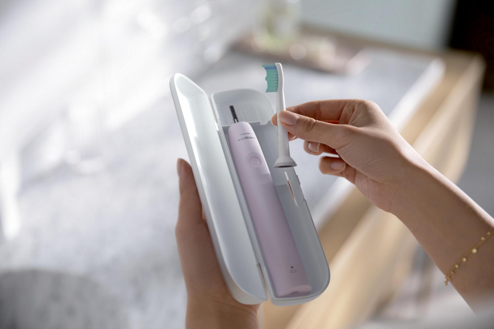 Periuta de dinti sonica electrica PHILIPS Sonicare Seria 2100 HX3651/11, 31000 miscari/minut, Cronometru Quadpacer si SmarTimer, Design ergonomic subţire, 1 capat de periere, Roz, L x A x I (mm) 109x63x220