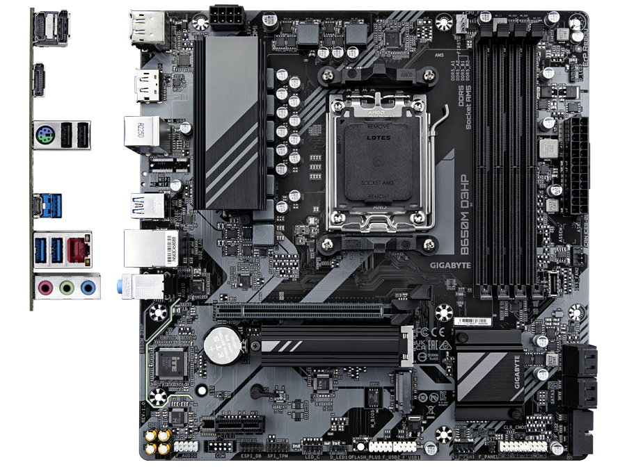 CPU AMD Socket AM5, support for: AMD Ryzen™ 7000 Series Processors (Go to GIGABYTE's website for the latest CPU support list.) Chipset AMD B650 Memory Support for DDR5 7600(OC)/ 7200(OC)/ 7000(OC)/ 6800(OC)/ 6600(OC)/ 6400(OC)/ 6200(OC)/ 6000(OC)/ 5600(OC)/ 5200/ 4800 MT/s memory modules 4 x DDR5 DIMM sockets supporting up to 192 GB (48 GB single DIMM capacity) of system memory Dual channel memory architecture Support for non-ECC Un-buffered DIMM 1Rx8/2Rx8/1Rx16 memory modules Support for AMD EXtended Profiles for Overclocking (AMD EXPO™) and Extreme Memory Profile (XMP) memory modules (The CPU and memory configuration may affect the supported memory types, data rate (speed), and number of DRAM modules, please refer to "Memory Support List" on GIGABYTE's website for more information.) Onboard Graphics Integrated Graphics Processor with AMD Radeon™ Graphics support - 2 x DisplayPorts, supporting a maximum resolution of 3840x2160@144 Hz * Support for DisplayPort 1.4 version. - 1 x HDMI port, supporting a maximum resolution of 4096x2160@60 LAN Realtek® 2.5GbE LAN chip (2.5 Gbps/1 Gbps/100 Mbps) Expansion Slots CPU: - 1 x PCI Express x16 slot, supporting PCIe 4.0 and running at x16 Chipset: - 1 x PCI Express x1 slot, supporting PCIe 3.0 and running at x1 Storage Interface Integrated in the CPU: - 1 x M.2 connector (Socket 3, M key, type 2580 PCIe 4.0 x4/x2 SSD support) (M2A_CPU) Chipset: - 1 x M.2 connector (Socket 3, M key, type 22110/2280 PCIe 4.0 x4/x2 SSD support) (M2C_SB) - 4 x SATA 6Gb/s connectors RAID 0, RAID 1, and RAID 10 support for NVMe SSD storage devices RAID 0, RAID 1, and RAID 10 support for SATA storage devices