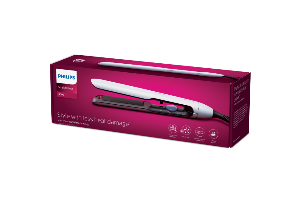 Placa de indreptat parul PHILIPS Prestige BHS520/00, Tehnologie ThermoShield, Placi infuzate cu ulei de argan, 230°C, Ingrijire ioni, 12 setari temperatura, Husa termorezistenta, Albastru deschis, L x A x I (mm) 120x370x95
