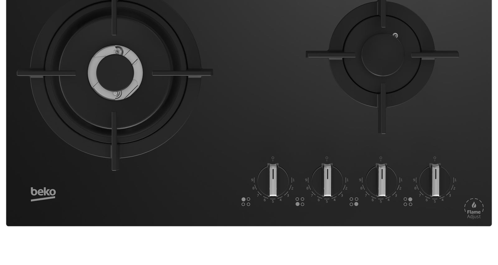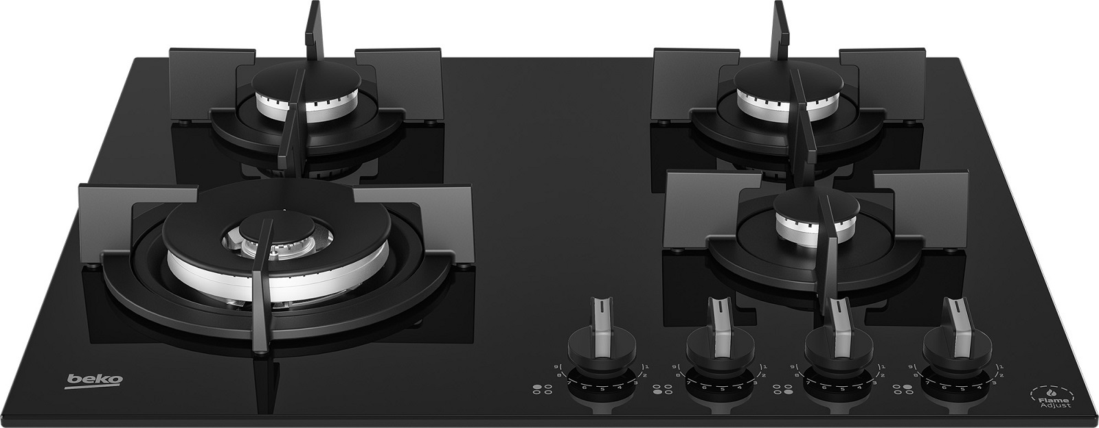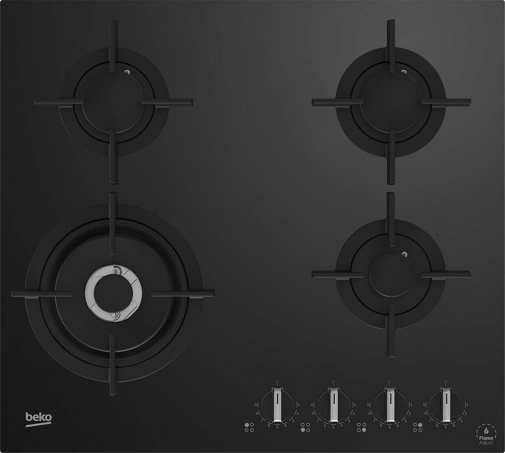 Plita incorporabila Beko HILW64322S, Gaz, Control butoane, FlameAdjust™, 4 arzatoare (1 Wok), Suport vase din fonta, Siguranta plita, L 60 cm, Sticla neagra