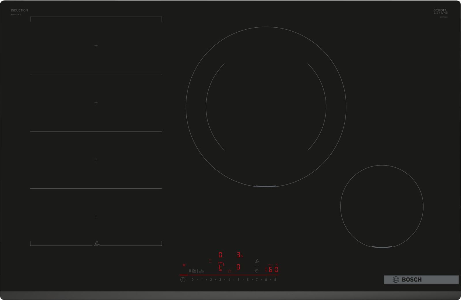 Plita incorporabila Bosch PXE831HC1E, Inductie, 4 zone de gatit, Flex Zone, Home Connect, Power Boost, 80cm, Negru