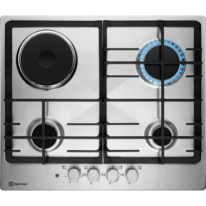 Plita incorporabila Electrolux KGM64311X, Mixta, 3 Arzatoare gaz, 1 zona de gatit electrica, Aprindere electrica, Siguranta gaz, Gratare fonta, 60 cm, Inox
