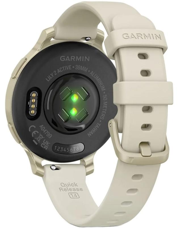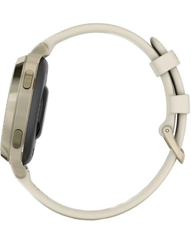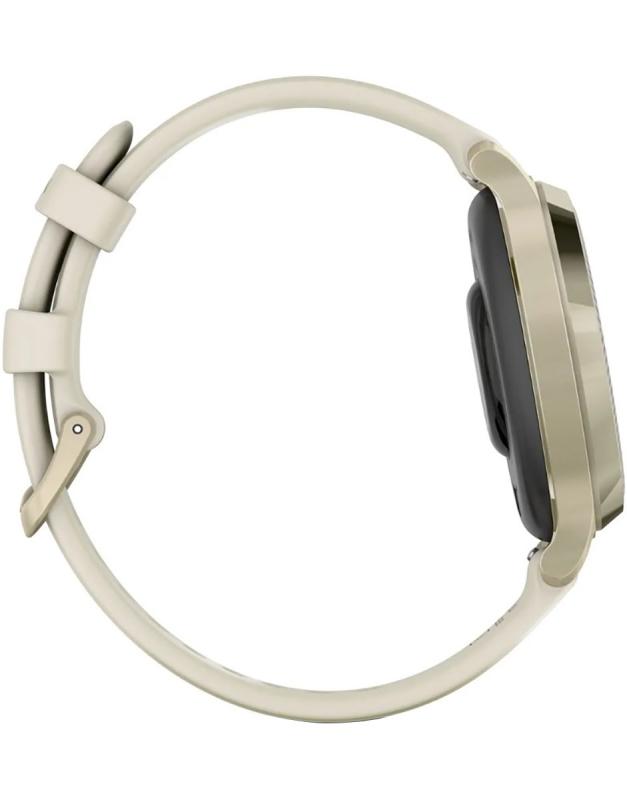 Ceas Garmin Lily 2 Active, display AMOLED, dimensiune afisaj 25,4 mm x 21,3 mm, rezolutie afisaj 240 x 201 pixeli, memorie 8GB, autonomie pana la 9 zile, rezistanta la apa pana la 5 ATM, greutate: 24,4g, ramă MLunar Glod şi curea Bone din silicon