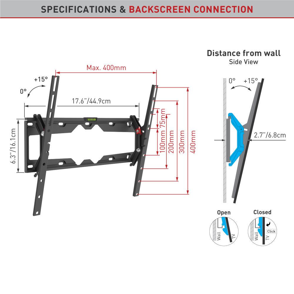Suport TV de perete Barkan, pentru ecrane de pana la 13" - 65", greutate maxima suportata 36kg, distanta fata de perete 80mm - 205mm, VESA max. 400x400 mm, negru