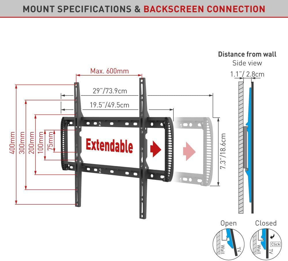 Suport TV de perete Barkan, pentru ecrane de pana la 13" - 90", greutate maxima suportata 60kg, distanta fata de perete 80mm - 200mm, VESA max. 600x400 mm, negru