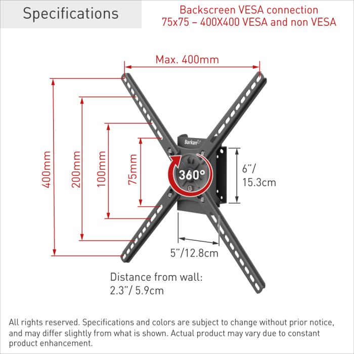 Suport TV perete Barkan, rotatie landscape si portret, dimensiune compatibila ecran 13-65", greutate maxima suportata 36kg, VESA max 75x75mm-400x400mm, distanta fata de perete 2.3"/ 5.9cm, negru