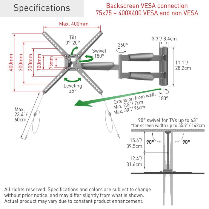 Suport TV perete Barkan, conceput pentru utilizare exterioara,pentru display-uri cu diagonale cuprinse intre 13" si 65", suporta pana la 36kg, VESA min. 75x75mm, VESA max. 400x400 mm, distanta maxima fata de perete 76cm, gri. Garantie 10 ani.