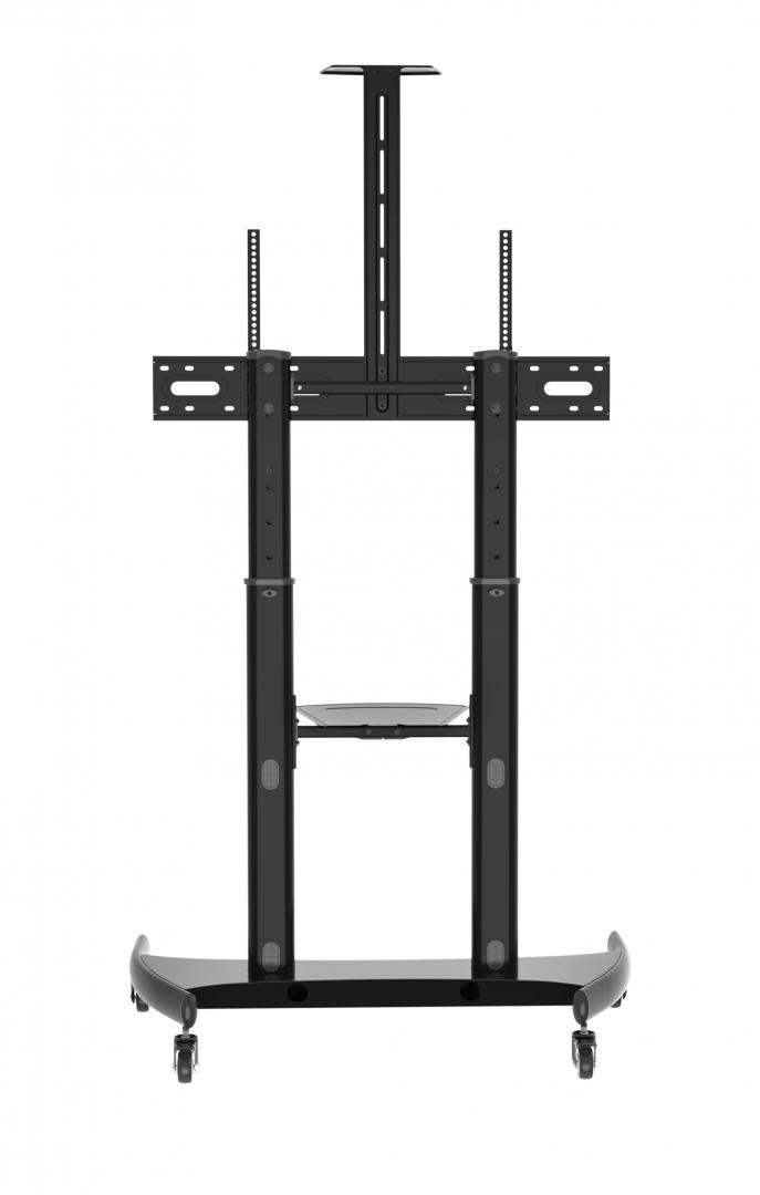 Stand TV mobil Serioux TV610TW 60"-100", dimensiuni: 1220x710x2045~ 2365mm, compatibilitate dimensiune ecran: 60"-100", compatibilitate VESA: 400x400, 600x400, 800x400, 800x600, 900x600, 1000x600, Greutate maximă suportata: 100 kg, interval de înclinare: +5°~-10°, interval de înălțime: 1365~1685mm, greutate maximă suportata raft: 5 kg, greutate maximă suportata a suportului pentru cameră: 5 kg, inălțimea raftului reglabilă