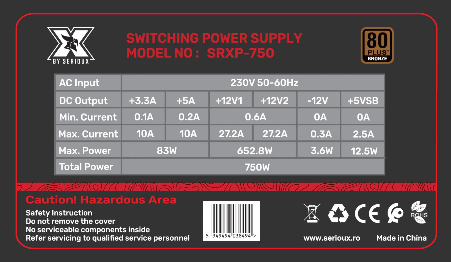 Sursa Serioux Energy 750W, Ventilator 12cm, ATX, material metal, cabluri: 20+4-pin, 1x4+4-pin, 2x6+2-pin, negru